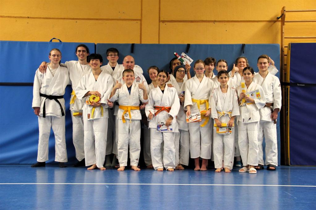 So können sich über neue Gürtelfarben freuen: Alexander Stibor, Jonna Jacobs und Sami Körner (gelb), Annabel Brumm, Nils Kilb, Ha-Jin Kim und Nina Väth (gelb-orange) sowie Zeeba Dilawar, Zinat Dilawar, Hermann Kramer, Carline Majer und Ben Rindfleisch (grün). Bereits im September hatte Robin Lüth die umfangreiche Prüfung zum 1. Dan (schwarz) nach einwöchigem Intensiv-Lehrgang abgelegt. Zusammen mit seinem Vereinskameraden Luca Mesterharm galt es dabei, die komplette Kata bestehend aus 30 Würfen zu zeigen. Auch Luca hat von den fünf Modulen der Prüfung zum 1. Meistergrad vier mit Bravour bestanden, kann den letzten Teil, die Kata, aber erst im März diesen Jahres ablegen, da die geforderte Wartezeit von 2 Jahren nach dem 1. Kyu (braun) noch nicht ganz erfüllt war. Einen kleinen Teil dieser Kata mussten die oben genannten Grüngurt-Anwärter bereits zeigen. Dies gelang Caroline Majer und Zeeba Dilawar besonders gut. Trainer Lothar Strecker und Assistentin Denise Mesterharm freuen sich auf weitere Prüfungen in 2024. (Foto: Michaela Majer)
