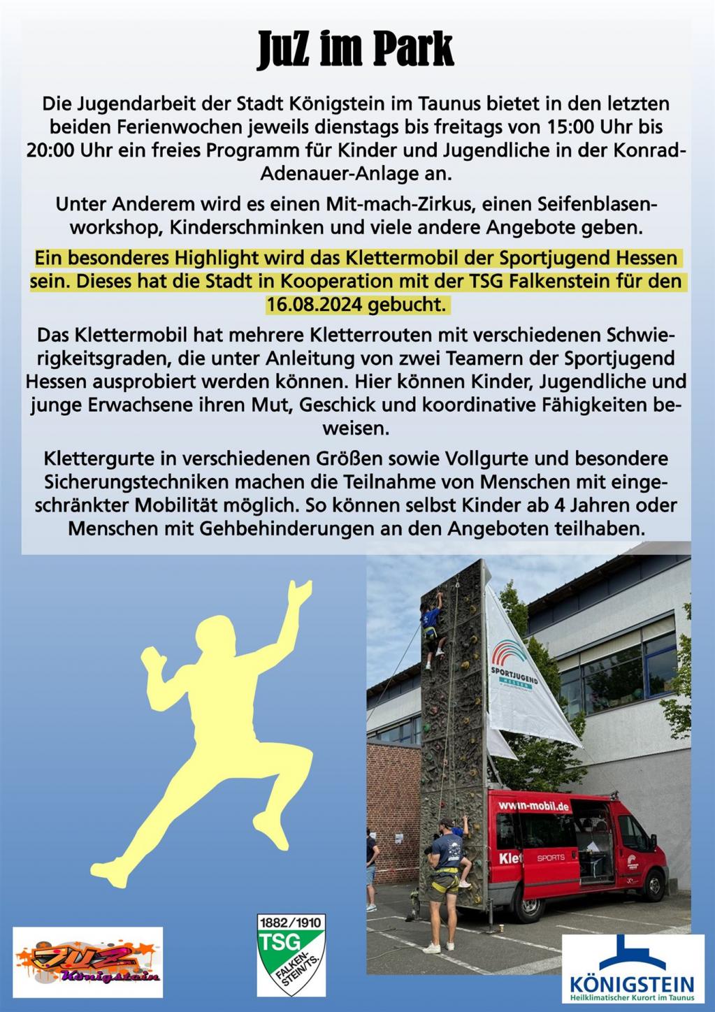 Am 16.8. wird das Klettermobil der Sportjugend Hessen unter der Beteiligung der Stadt Königstein und der TSG Falkenstein in der Konrad-Adenauer-Anlage haltmachen!